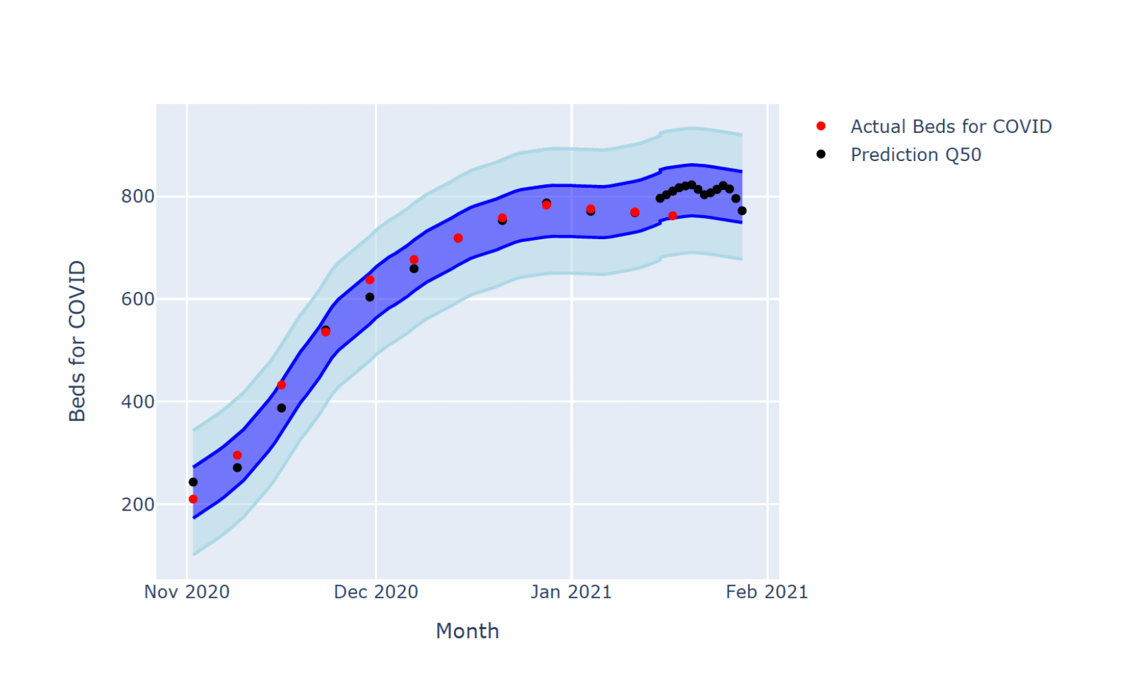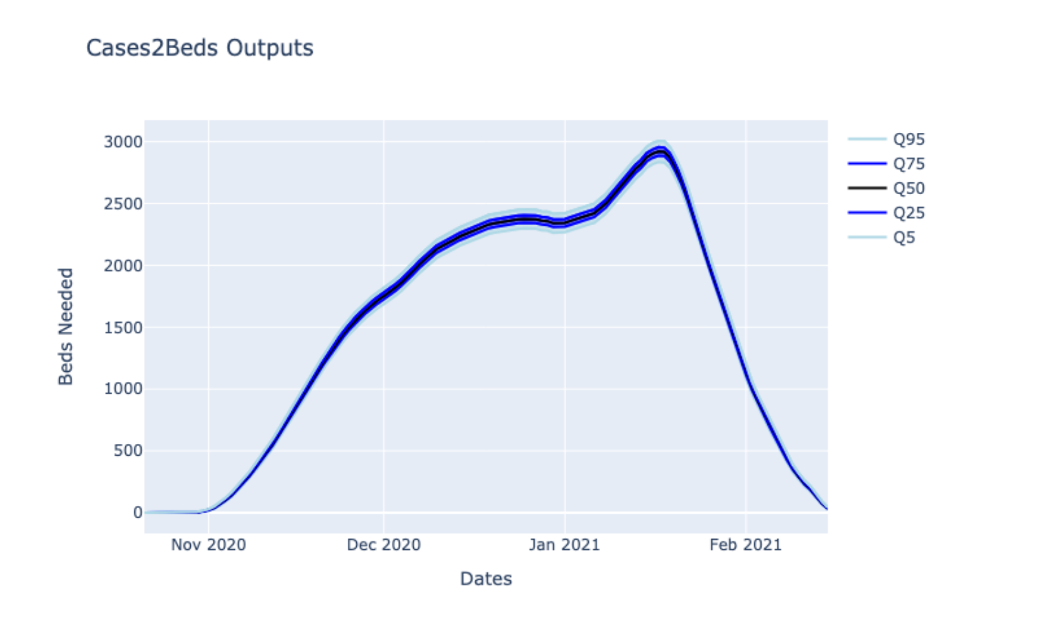 Fig. 3: Output of Cases2Beds using historical data until January 21st for Random US County